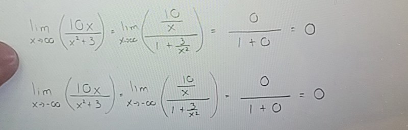 Första raden:Jag förstår att när x går mot oändligheten positivt så blir kvoterna 0. Det som finns kvar är ettan men eftersom det är noll i täljaren så blir allt noll.