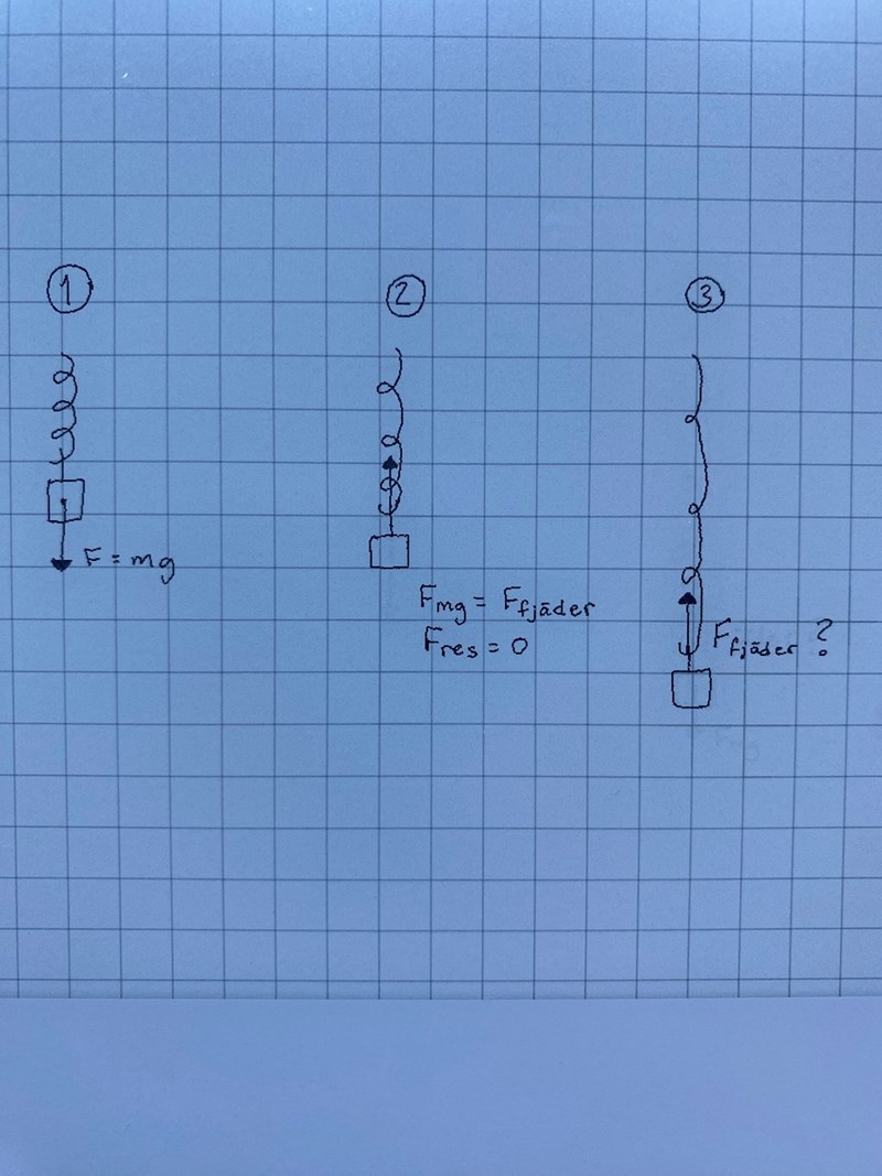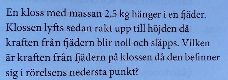 En pendel med en massa av 2,5 kg kopplad på den lyfts från jämvikt till en punkt ovanför där kraften är noll i fjädern. Den släpps, och frågan är hur stor kraft det är i fjädern i lägsta punkten. Det ska vara dubbelt så stor som tyngdkraften på vikten därför att förlängningen är dubbelt så stor som förlängningen till jämviktspunkten.