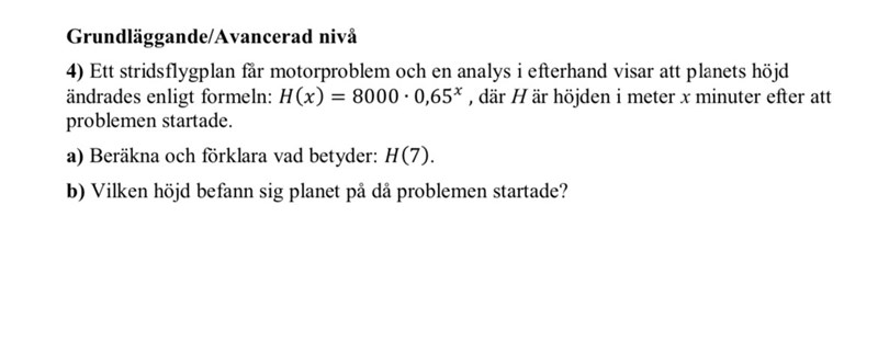 Ett stridsflygplan får motorproblem och en analys i efterhand visar att planets höjd ändrades enligt formeln: 𝐻(𝑥) = 8000 ∙ 0,65𝑥 , där H är höjden i meter x minuter efter att problemen startade.