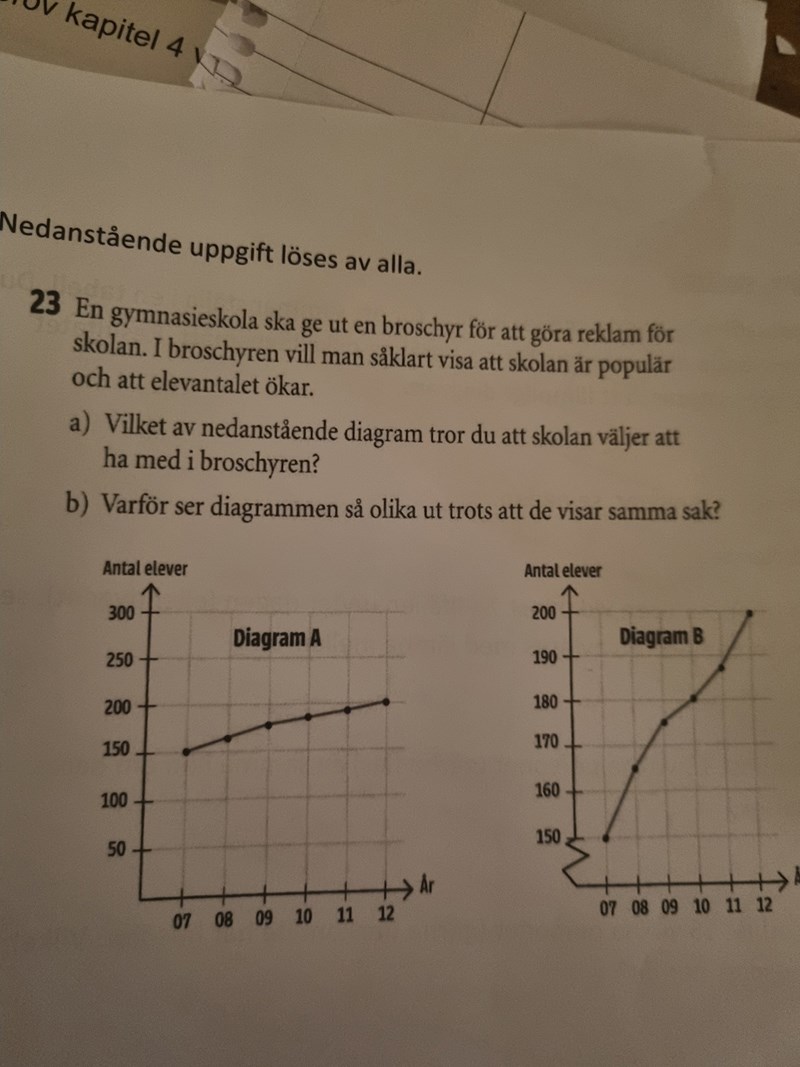 Ja, de har olika gradering. Dels kan du jämföra var diagrammen börjar från. Den krokiga linjen visar att det digrammet inte börjar från 0. Dels kan du titta på hur många elever en ruta uppåt i digrammen motsvarar.
