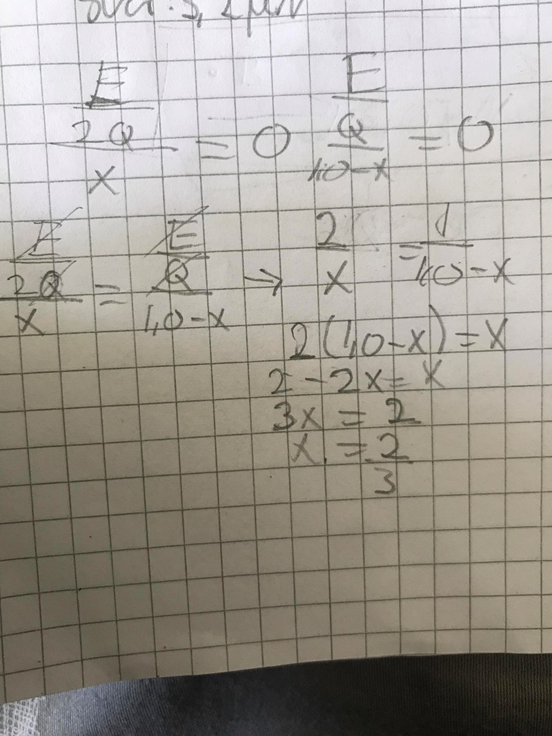 uppgiften: laddningen 2Q och laddningen Q befinner sig 1,0 längdenheter från varqandra. i en punkt mellan dessa laddningar är den totala elektriska fältstyrkan noll. Beräkna avståndet från 2Q till denna punkt.