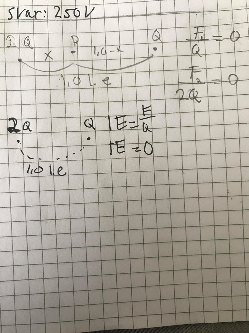 Smaragdalena skrev:Om avståndet från laddningen 2Q till punkten P är x, hur stort är då avståndet från punkten P till laddningen 1Q?