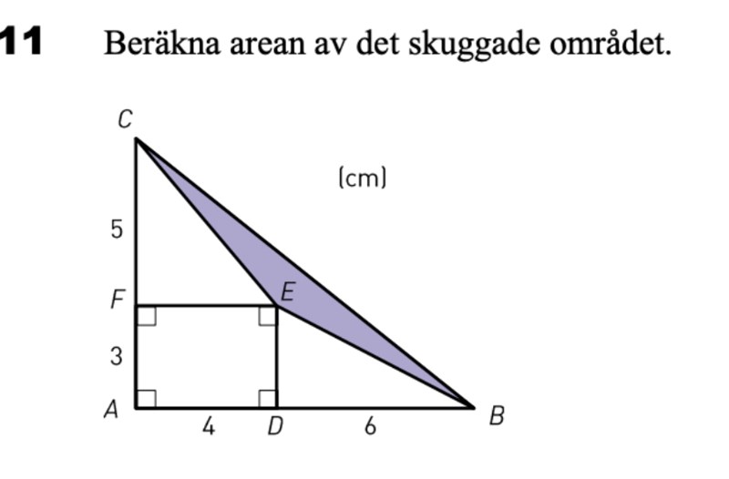 Testa räkna ut arean för hela den stora triangeln och minusa bort de andra 3 bitarna, som är lättare att räkna ut.