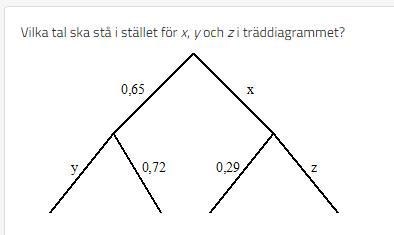 Varje förgrening visar ett "vägval" som en slumpvariabel kan ta. Att det är 0.65 uppe till vänster, betyder att det är 65 % chans att slumpvariabeln tar den vägen. Men det är 100 % chans att den väljer *någon* väg, så de återstående 35 procenten måste ligga i andra riktningen, alltså x:et. Så x måste vara 0.35.