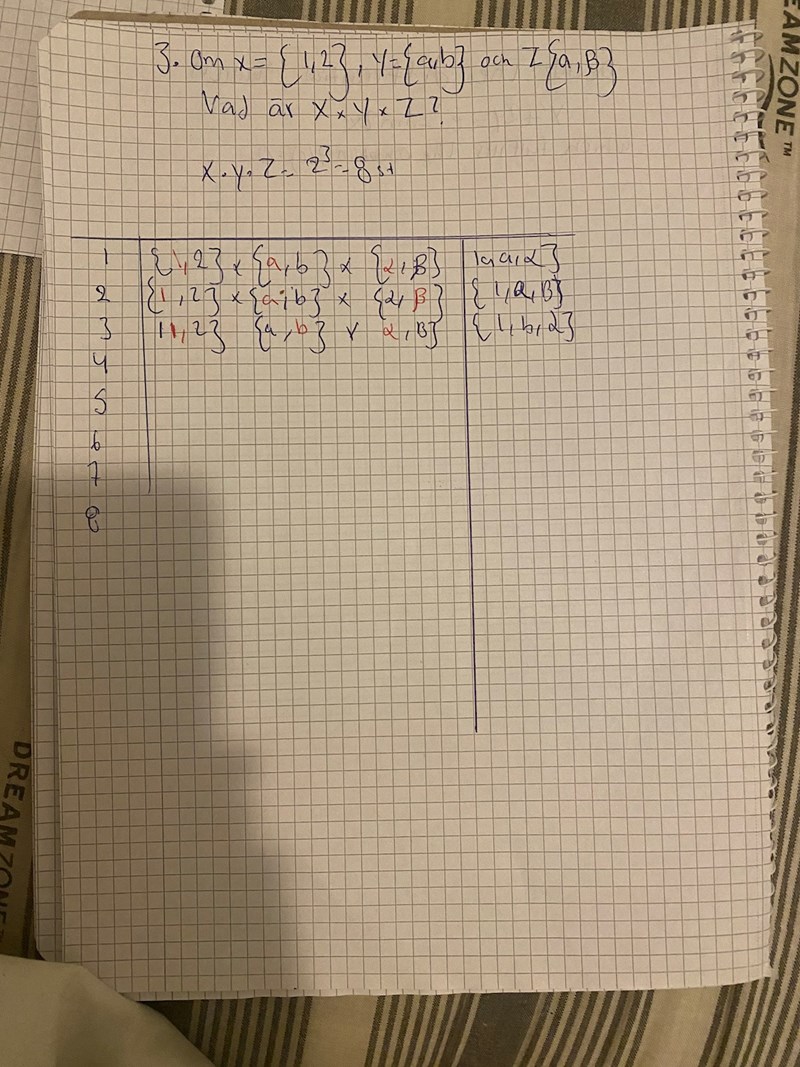Elementen i den kartesiska produkten kan inte vara mängder, de måste bevara ordningen mellan mängderna i produkten. Tupeln (1, a, ) är alltså det första elementet.