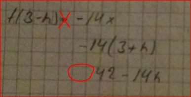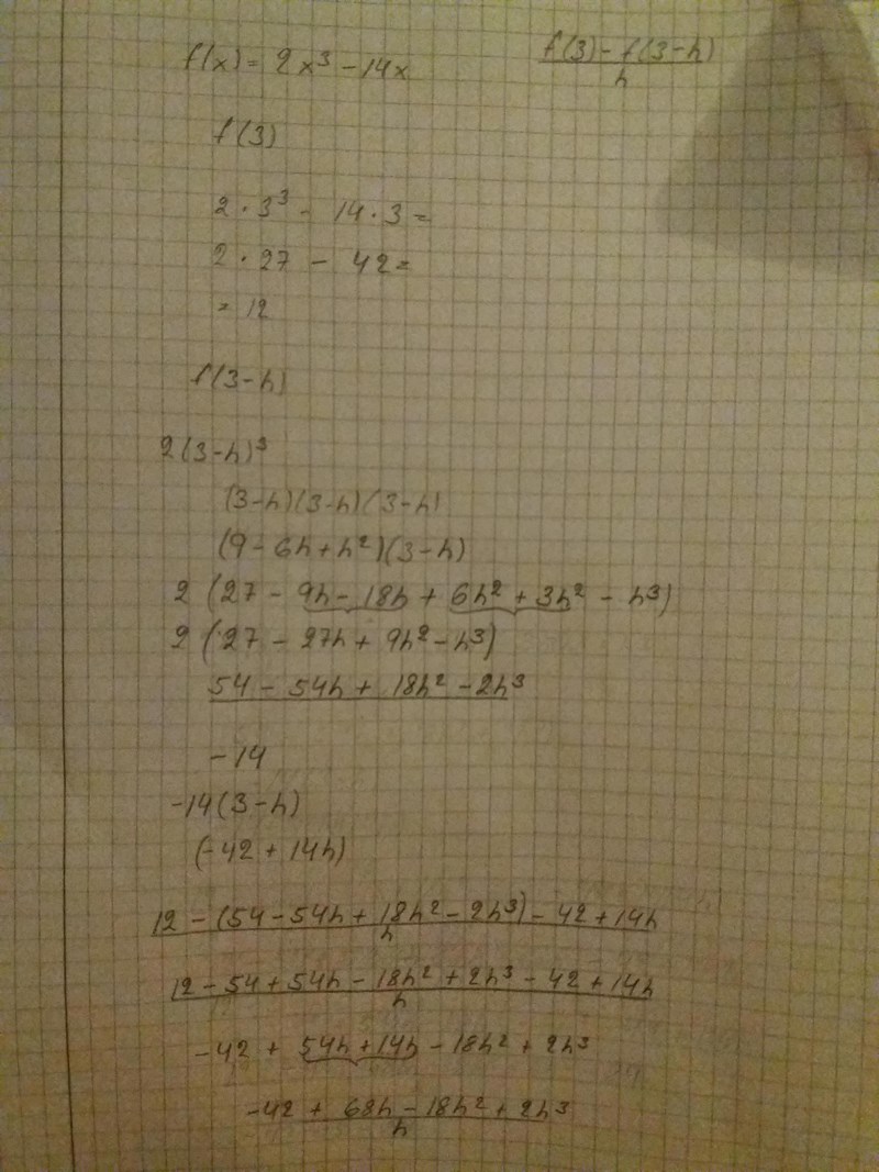 Ett par små teckenfel blev det också på mellanresultaten där du räknar -14x, dvs -14(3+h) och -14(3-h). Men det verkar som om du vände de teckenfelen rätt igen.