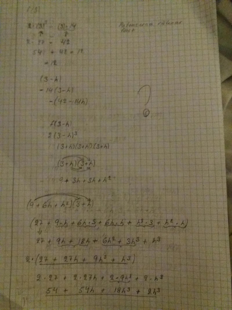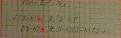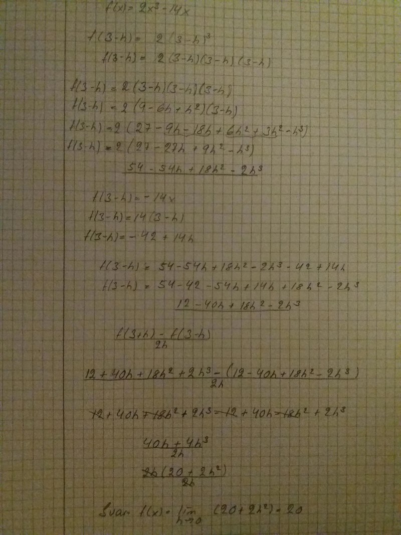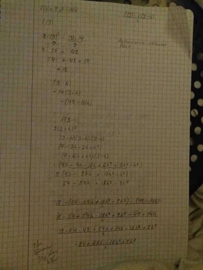 Skriv upp hela uttrycket för f(3) och hela det förenklade uttrycket för f(3-h) innan du använder dem i differenskvoten Päivi.