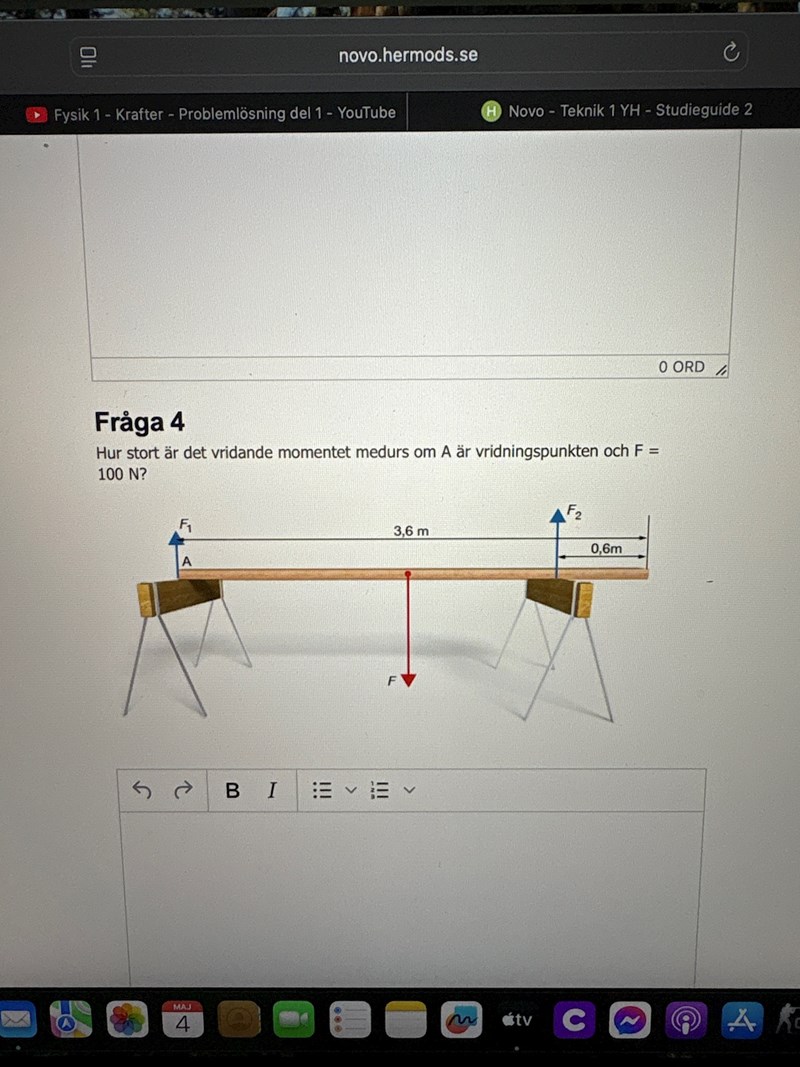 Om de menar momentet som endast F ger och om det är tyngdkraften blir svaret avståndet till plankans tyngdpunt multiplicerat med 100 newton.