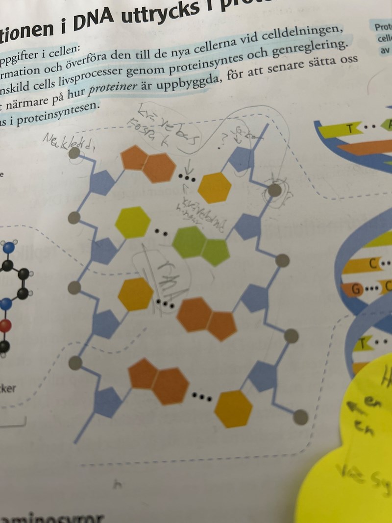 Eller så söker du på delarna var och en för sig - så kan du jämföra med bilden ur din bok. Du ser ut att ha en förenklad bild med DNAs struktur, och strukturen för en nukleotid på samma bild (och delarna tycker jag borde vara beskrivna i texten).