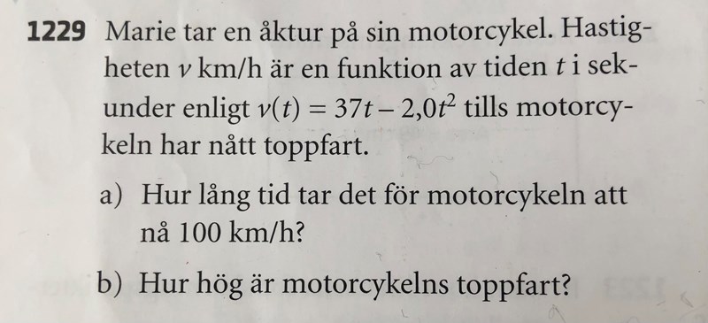 Jo tänk såhär: Marie åker på sin motorcykel, hon börjar vid t=0. Och hennes hastighet når 100km/h första gången efter 3,3s. Sedan ökar henns hastighet mer efter längre tid. Snart börjar hennes hastighet sjunka, då den sjunker passerar hastigheten 100km/h en gång till. Man är ju ute efter när hon når 100km/h första gången.