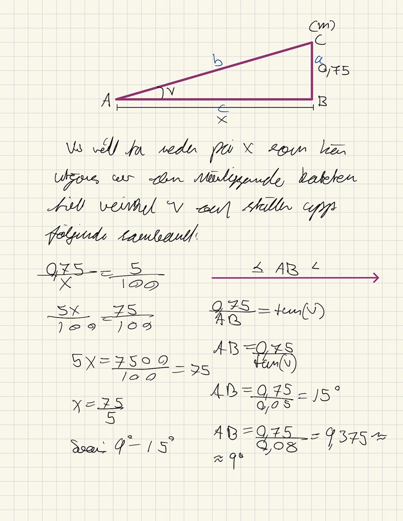 Tänk dig att det fanns en byggnorm för rullstolsramper, formulerad så här: Tangens för vinkeln får inte understiga 5% och får inte överstiga 8%.