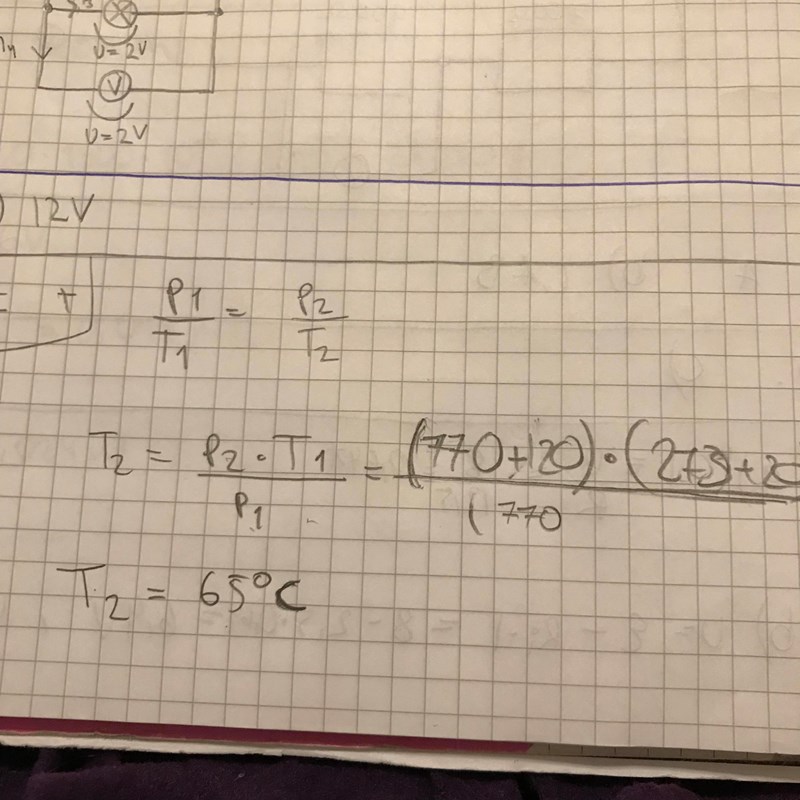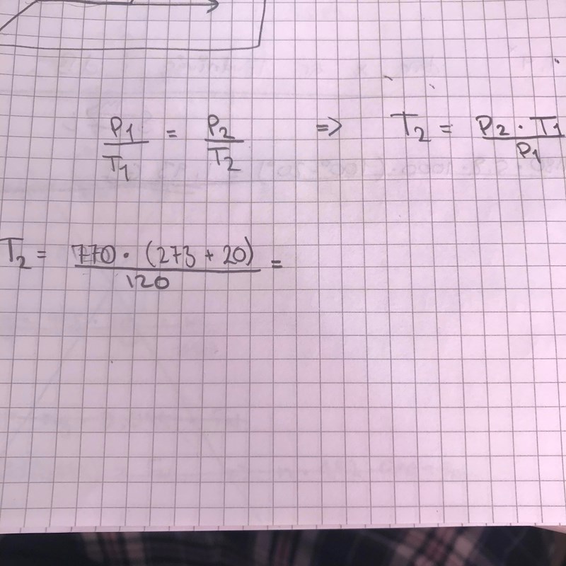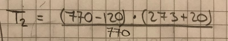 Nej. Du har idealgaslagen . Vi är bara intresserade av p och V, så vi kan skriva om det till , där högerledet är konstant. Vi har alltså , vilket kan skrivas om till , alltså den högre temperaturen är lika med den lägre temperaturen multiplicerad med 770/650.