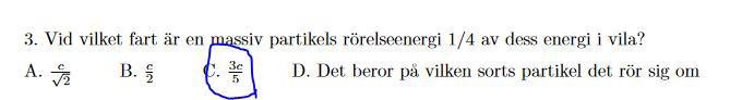 Vid vilket fart ̈ar en massiv partikels r ̈orelseenergi 1/4 av dess energi i vila?