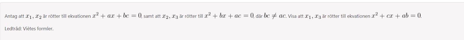 Detta är min lösning: vi vet från vietes formler att x1x2 = bc samt x2x3=ac, om vi multiplicerar detta får vi att x1*x2*x2*x3= bc*ac -> x1*x3 = ab*c^2/(x2)^2. och det vi vill få harifrån är att x1x3 = ab, så (x2)^2 måste vara lika med c^2. vi tar roten ur det och får att x2 är antingen +-c. Nu när vi multiplcerar (x1+x2)(x2+x3) får vi = -a*-b = ab. om vi utvecklar det vidare får vi:x1x3+x1x2+x2x3+(x2)^2 = ab, och för att detta ska vara sant, att x1x3=ab, behöver vi att x1x2+(x2)^2+x2x3 = 0. och från detta faktoriserar vi ut ett x2 och får x2(x1+x2+x3) = 0, sätter att detta ska vara lika med 0 för att få att x1x3=ab.så x2 får inte vara lika med 0 då vi kan ej dela med noll, då i början vi dividerade med (x2)^2. Så vi jobbar endast med : x1+x2+x3 = 0, och från det får vi att x1 + x3 måste vara lika med -x2, och vi behöver att x1+x3 vara lika med -c, så x2 måste vara lika med c.Slutsats: För att x1 och x3 ska vara rötter till x^2+cx+ab, behövs det alltså att x2 = -c.