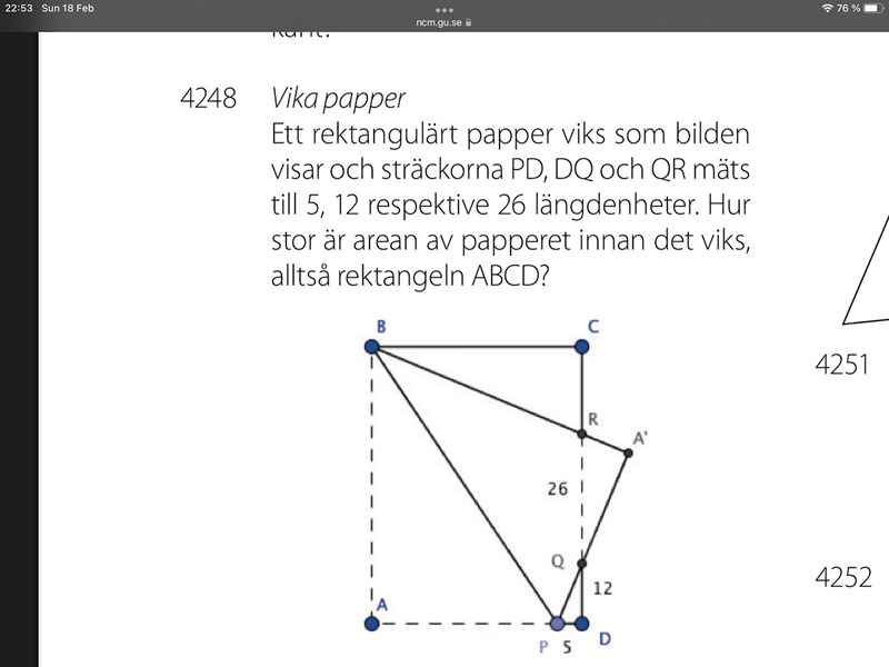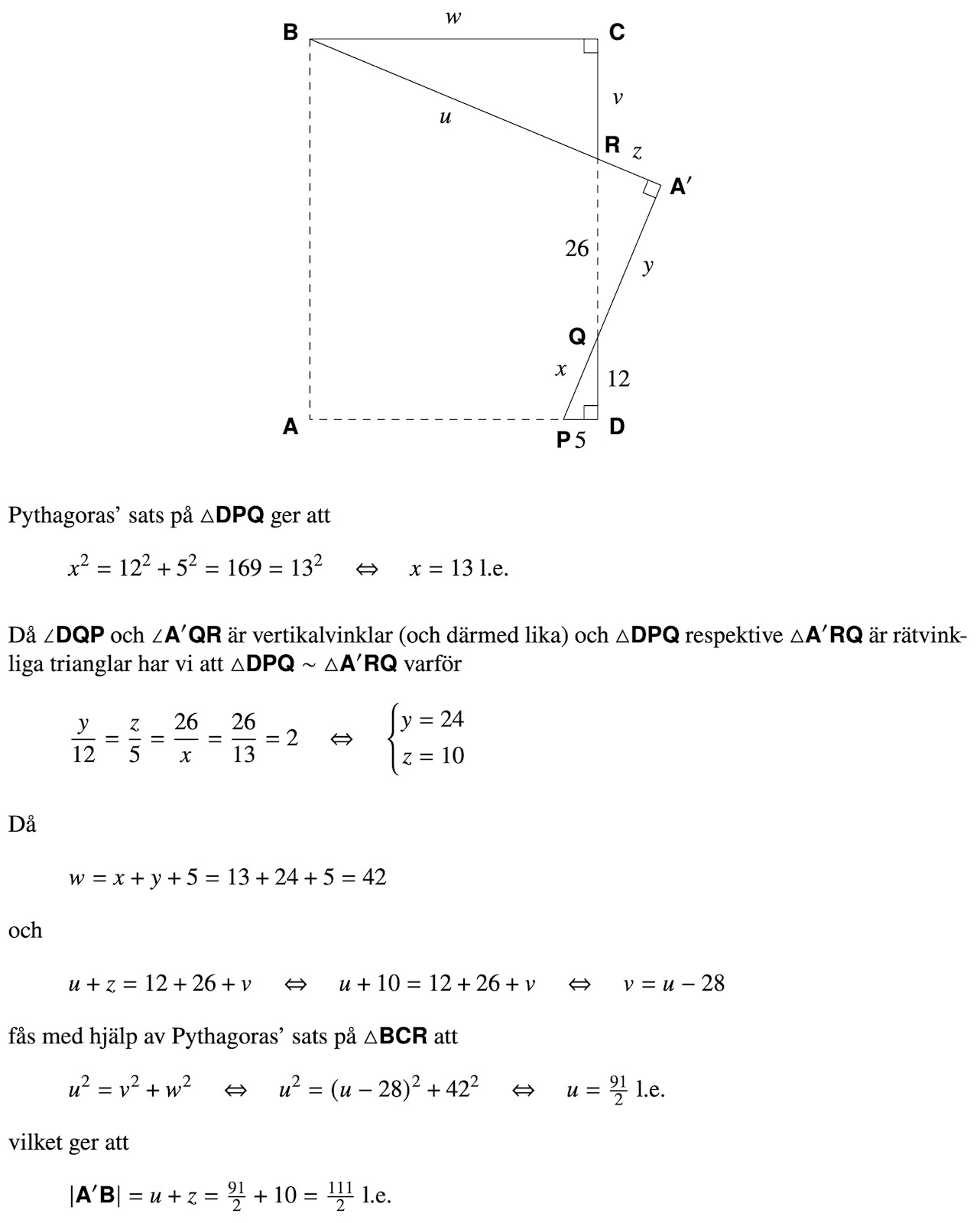 Den lilla triangeln PDQ har sidorna 5, 12, 13 (jag kände igen siffrorna från en av de pytagoreiska trianglarna). Denna triangel är likformig med triangeln QRA' som har sidorna 26, 24, 10. Sedan har jag inte räknat färdigt, men det är så jag skulle börja.