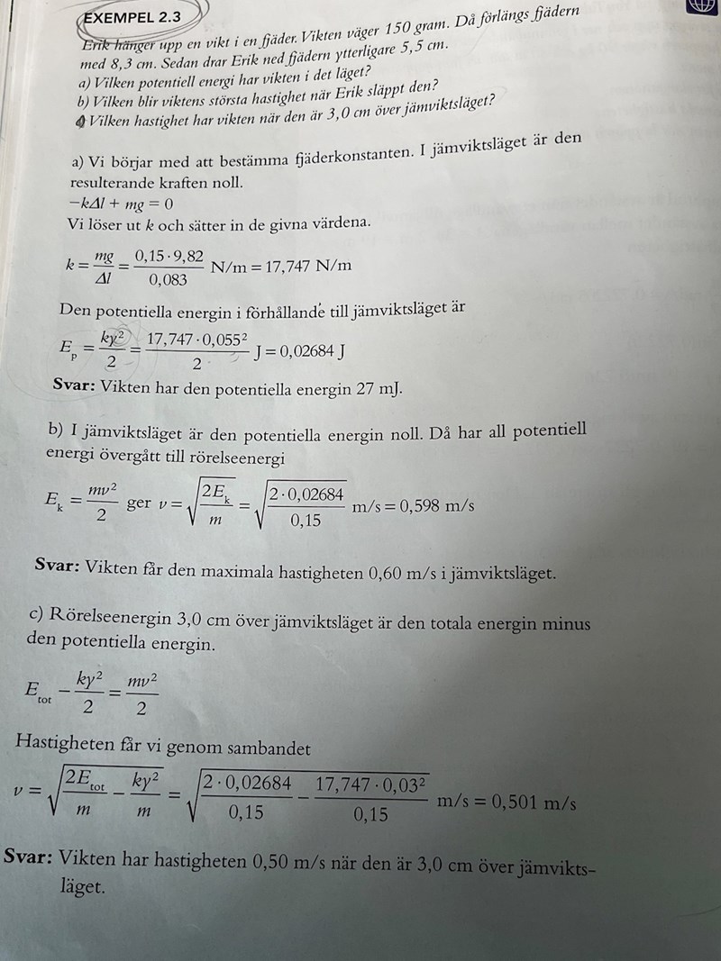 I a-uppgiften beräknar du hur stor lägesenergin är när den är som störst, d v s i ett av vändlägena. Summan av lägesenergi och rörelseenergi är konstant, och i vändlägena är hastigheten 0 (vikten ändrar ju riktning just där). När vikten är i höjd med jämviktsläget är lägesenergin 0, så all energi är rörelseenergi. Då kan man beräkna hur snabbt vikten rör sig i detta läge (b-uppgiften). Nu, i c-uppgiften, skall du beräkna hastigheten i ett läge där varken lägesenergin eller rörelseenergin är 0.