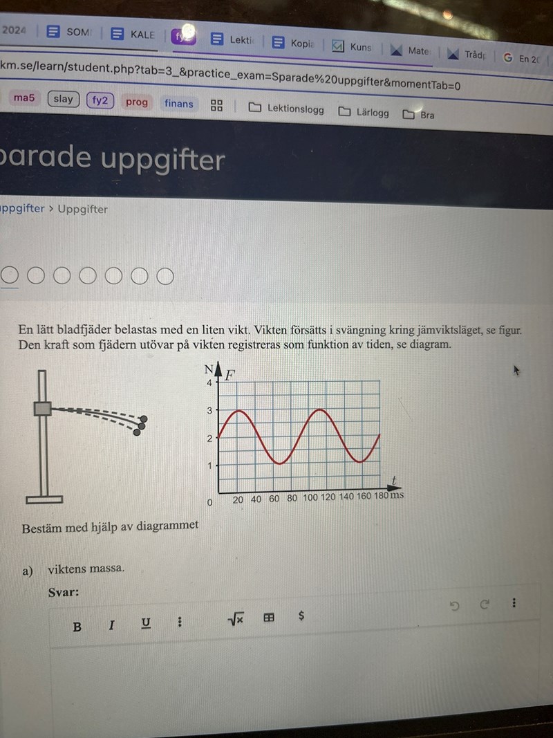 Jag har beräknat m=0,2kg (korrekt). Jag ska nu beräkna k i B frågan. Jag tog formeln: T=2pi*roten ur m/k och löste ut k så att det blev k=4pi^2•m/T^2