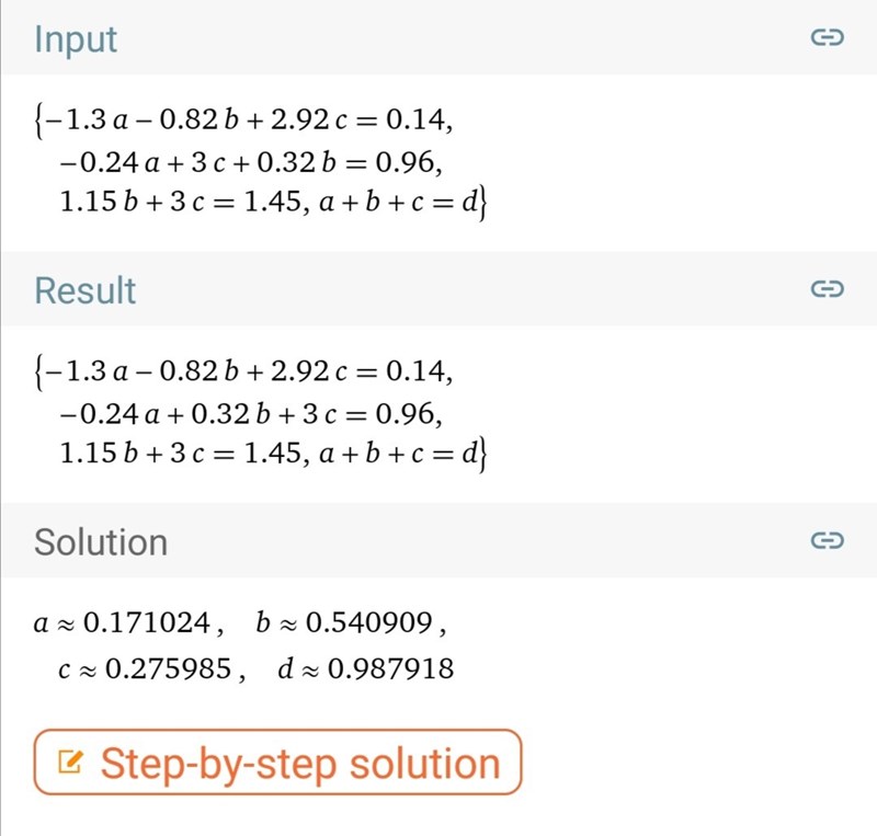 a, b och c är vikterna, d tog jag med för att kolla om svaret är rimligt. Verkar så, om vi antar avrundade siffror.