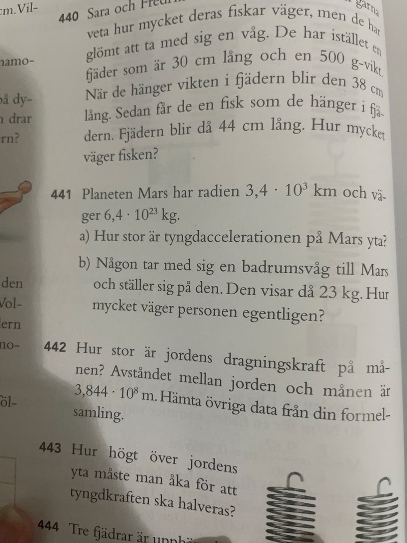 Jag förstår inte hur jag ska lösa b, förstår att jag ska använda mig 3,7 som är tyndaccelerationen på mars men fattar inte hur, 441
