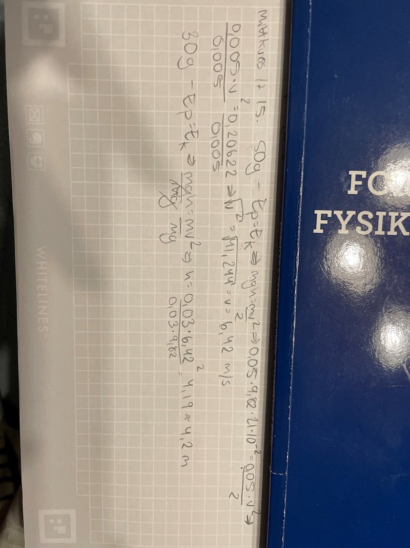 Mittkurs 17 15. är bara uppgiftens nummer. 50g är början på beräkningarna jag har gjort för 50g vikten. Sedan har jag utgått från energiprincipen och antagit att den potentiella energin omvandlas till kinetisk energi när 50g vikten far ner mot bordet. Då har jag använt mig av mgh=mv^2/2 och utgått ifrån siffrorna m=0,05 kg, g=9.82 N/kg och h=21*10^-2 m. Höger om likhetstecknet är m=0,05, v är okänt. Sedan har jag försökt bryta ut v för att få fram hastigheten som 50g vikten far ner med och därför samma hastighet som 30g skjuts upp med.