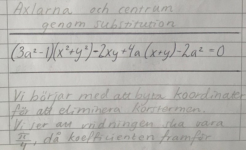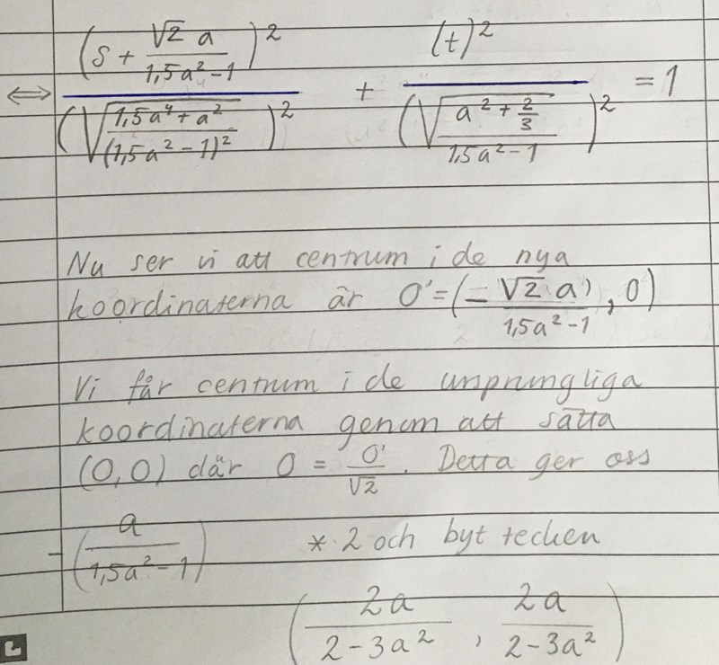 Då har jag alltså fått fram koordinaterna för ellipsens centrum och dessa är