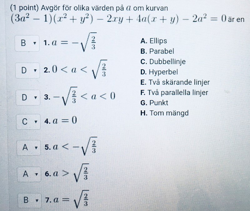 Jag tror att kurvan är en ellips när , dvs i fall 3 och 6 nedan. Verkar det rimligt?