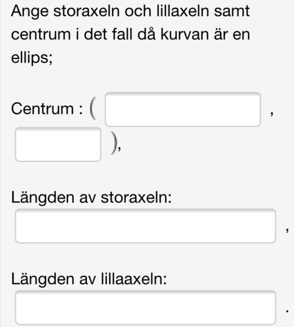 Min uppgift, som jag skulle behöva hjälp med är nu att ange centrum samt längderna för storaxel och lillaxel för när kurvan är en ellips. Hur ska jag börja?