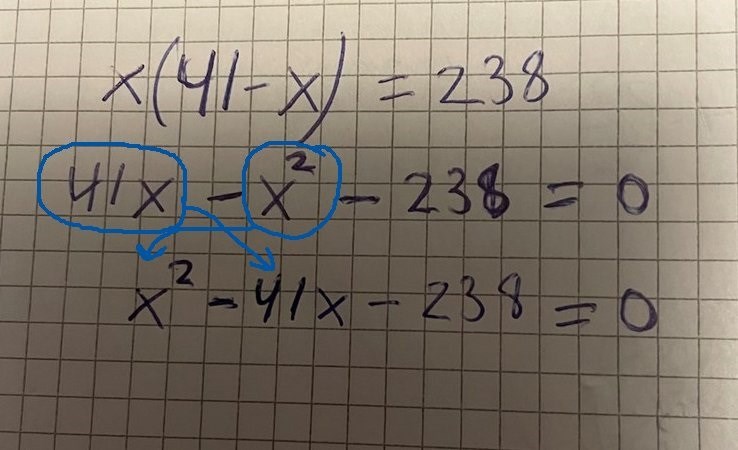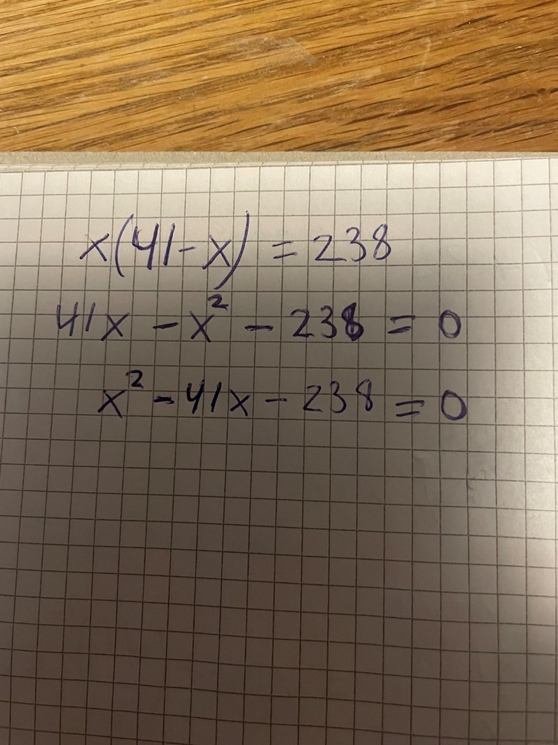 Du behöver få +x2 och därför multiplicerar du båda leden med -1. Du kan också flytta om termerna mellan leden som Yngve visade (addera/subtrahera båda leden tills du får x2 - 41x + 238 = 0.
