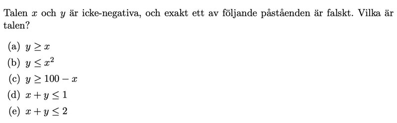 2. Om (a) är falskt och (b) är sant, kan då (c), (d) och (e) alla vara sanna? Vilka värden ska x och y ha i så fall?