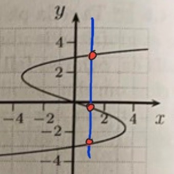 Den här grafen visar inte y som funktion av x eftersom jag har hittat ett x-värde för vilket det finns tre y-värden. Det finns alltså vertikala linjer som skär grafen på fler än ett ställe: