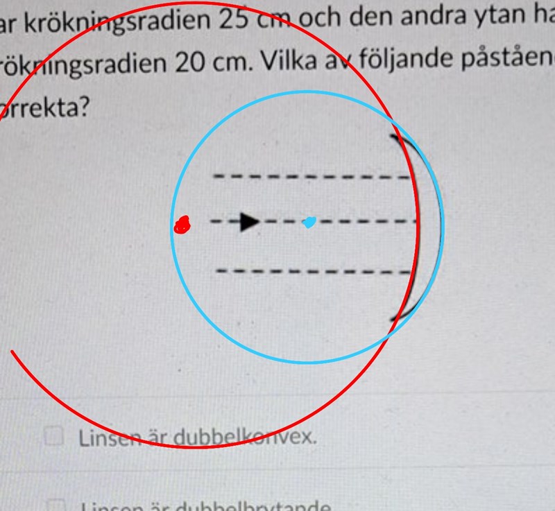 Enligt texten är R1 = -25 cm (röd), R2 = -20 cm (blå). Miniustecknen framgår inte i texten, utan jag tog dem från bilden. Jag ritade ut ungefärliga positioner för båda krökningscentra (mittpunkt till sfärerna).