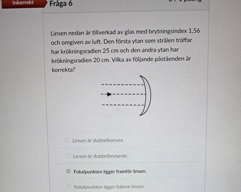 Jag förstår inte varför jag fått fel på denna fråga. Vad menas med dubbelbrytande ? Hur avgör jag om linsen är dubbelkonvex?