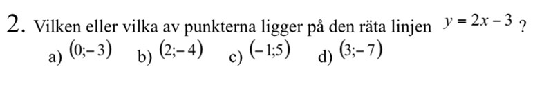 Smaragdalena skrev:Sätt in värdet x=3 i formeln y=2x-3 och se om det blir -7. Om det blir det, ligger punkten på linjen, annars inte.