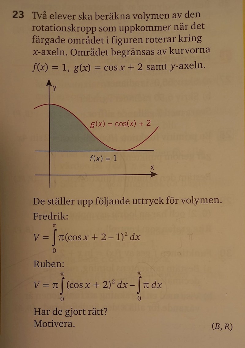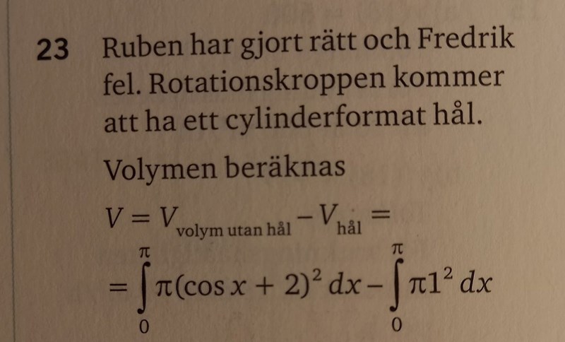 Hej! Kan någon förklara mer detaljerad varför Ruben har rätt? Varför är det π*12 i den andra integralen? Och varför är det så ? Jag skulle har trott att Frederik har rätt..