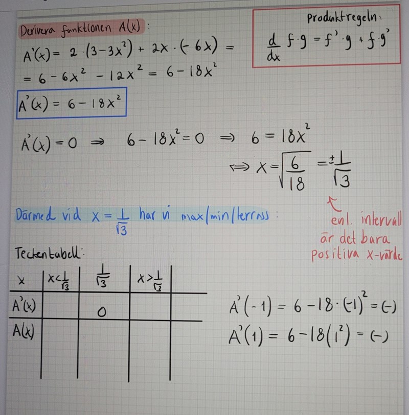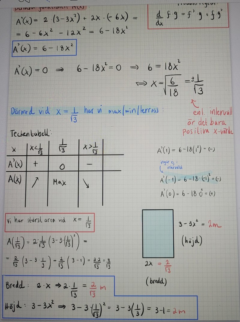 Tack, dock är jag lite osäker på själva intervallet jag själv fått fram. Jag insåg att 3-3x2 >0 och löser jag ut det får jag ut +-1 egentligen vilket blir lite förvirrande. Men jag antar att man i detta fallet bara tänker logiskt och inser att -1 inte kan räknas med för då är en längd negativ vilket det aldrig kan vara?