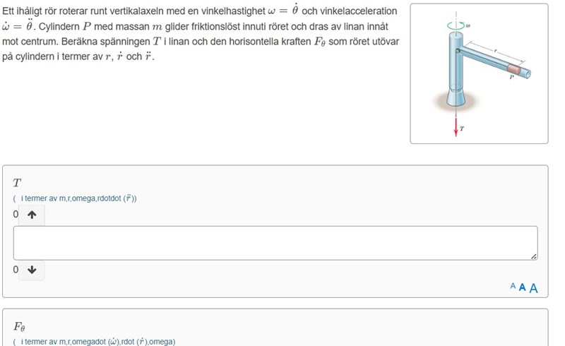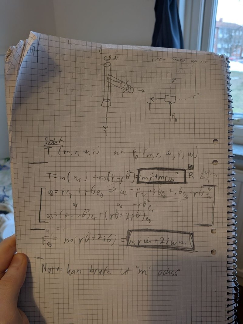 Dock jag stötte på ett problem igen för när jag skulle få fram kraften T och det blev tecken fel. INGENSTANS i uppgiften står det vilket håll som är positivt eller negativt. Asså ja den dras inåt men hur vet man att inåt är negativt. Man kanske kan tänka sig att radien blir mindre men so what, tänk om det var positiv riktning? Så jag gissade på tecknet.