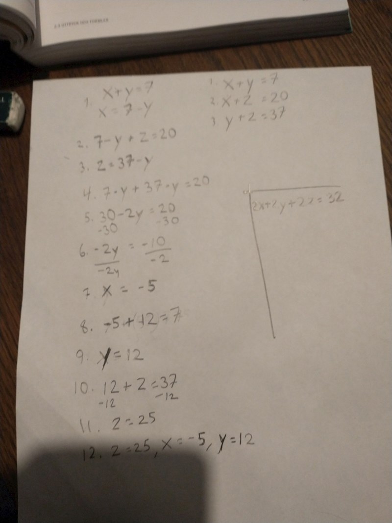 Ja, jag fick ihop det. Tack för hjälpen, hade inte kommit fram till det själv. Tog mest en bild för att visa att jag gjort något :) när jag satte in 7-Y i andra ekvationen tappade jag bort mig och fick för mig att jag löste ut Y istället för x så fick göra om där.