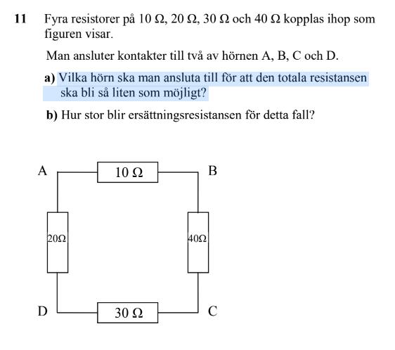 Vilka hörn ska man ansluta till för att den totala resistansen ska bli så liten som möjligt?