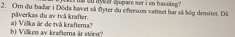 Tänk att flytkraften trycker dig uppåt och gravitationen drar dig nedåt, eftersom du flyter (alltså inte är på botten) måste ju …… vara störst