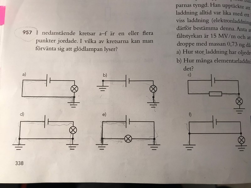 På b) rör sig elektronerna från pluspolen till den jordade punkten och sedan forsätter i nästa jordad punkt, alltså kommer lampan lysa? Resterande förstår jag mig inte på.