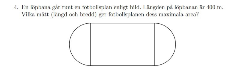 Hej! Vad jag har gjort är att skapa ett uttryck för längden s då jag vill bli av med en av variablerna. Då har jag tagit det jag vet om omkretsen är pi*2r + 2s = 400.
