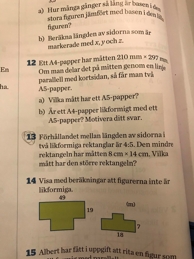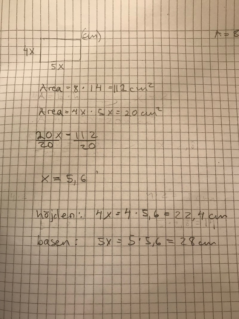 pepparkvarn skrev:Du behöver inte använda area, då måste du använda dig av förhållandet mellan längd- och areaskala. Lättare är istället att konstatera att 8 och 14 cm motsvarar fyran i "4:5". Hur många gånger större än den större rektangelns sidor?