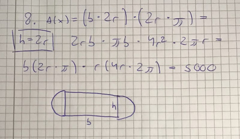 Du har fått fram att A(r) = 2r(2500-r). Du har beräknat att derivatan är A'(r) = 5000-12,6r. För vilket värde på r är derivatan lika med 0? Vilket värde har h för detta r?