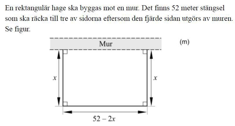 sen står det teckna ett uttryck för arean och bestäm vilket mått hagen ska ha för att arean ska bli så stor som möjligt