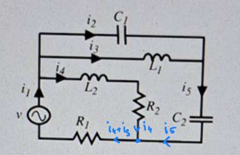 Ja okej jag ser nu att strömmen genom R1 inte är bara I4 utan I4+I5 så enligt kirchoffs strömlag blir det I1=I4+I5. Deras potentialvandring i B är isåfall inte rätt.