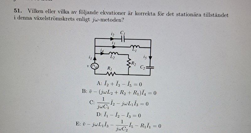 Jag förstår inte hur de räknar på B) alternativet. Om man gör potentialvandring borde man väl få v-jwLI4-R2I4-R1I4=0?