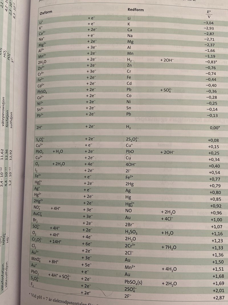 Smaragdalena skrev:Jag tänkte på t ex den här tabellen, men i just den här finns inte reaktionen 2 F- => F2 + 2 e- med. Den borde ha stått väldigt högt upp. De reaktioner som står högt upp "vill" väldigt gärna gå åt vänster, de som är långt ner "vill" gå åt höger. Här är alla reaktioner skrivna som oxidationer.