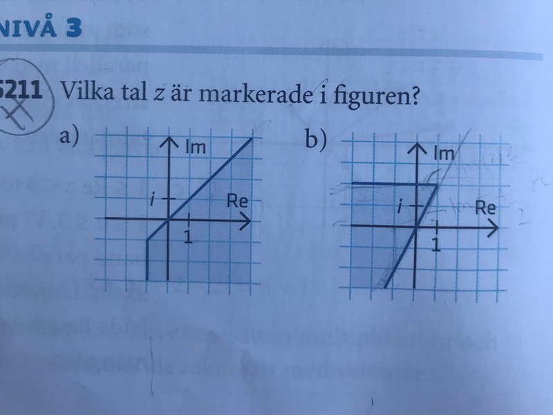 Hej, jag har suttit med denna uppgift väääääääldigt länge nu utan att ha förstått den 100%. Jag har fastnat på b). Jag förstår inte hur man kommer fram till att 2*Re(z) ”mindre än lika med tecknet” (<) Im (z). Jag har förstått det andra intervallet men jag kan inte se det framför mig att det ska vara just ”mindre än eller lika med tecknet” . :(