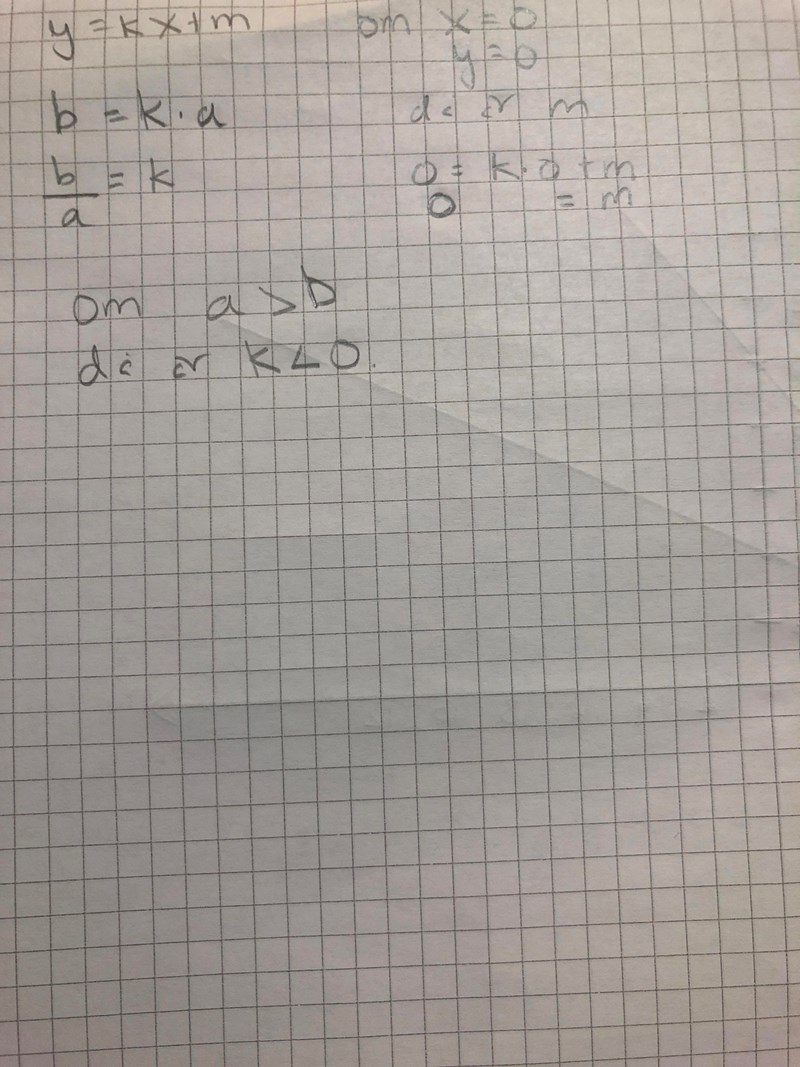 En rät linje går genom punkterna med koordinaterna (0,0) och (a,b) där a (är ej = med) 0 och b (är ej = med) 0. För vilka värden på a och b har linjen genom punkterna ett negativt värde på riktningskoefficienten?
