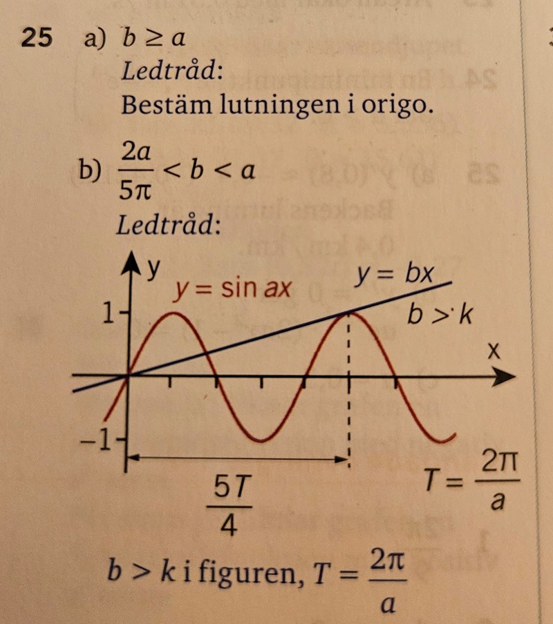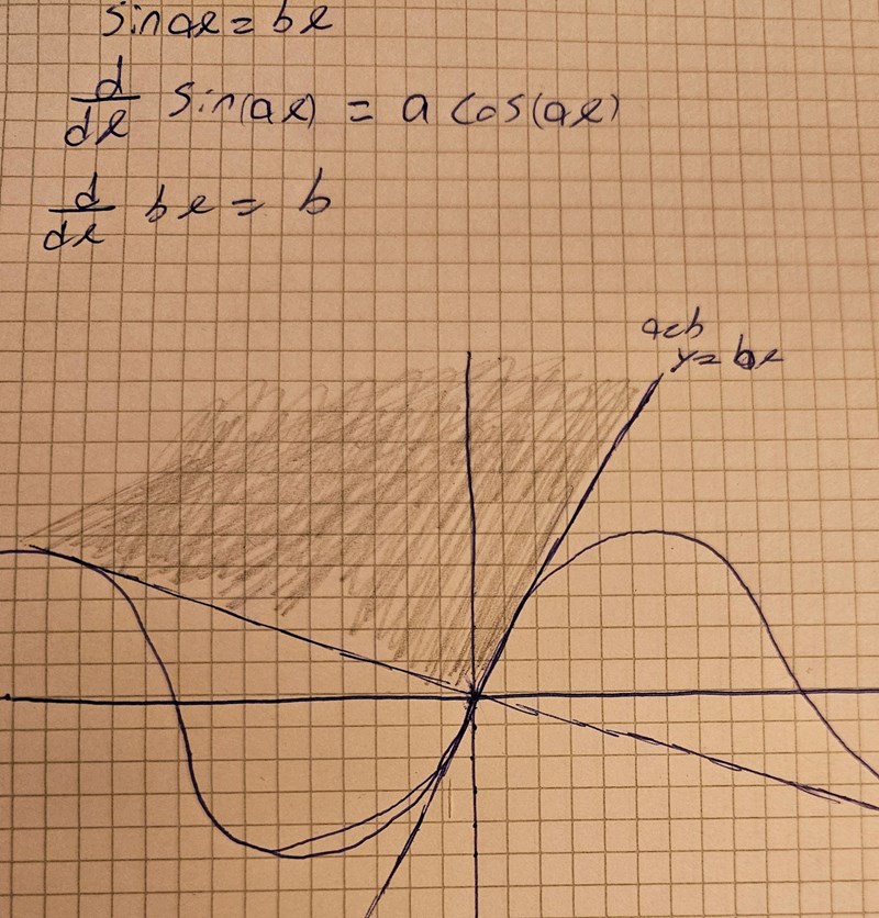 Innan jag ger mig på b uppgiften, har du någon idé om hur jag skulle kunna lösa uppgift a där x kan anta negativa värden? Vet inte riktigt hur jag ska bestämma den andra linjen jag har dragit, då jag inte vet var på sinuskurvan som linjen tangerar.